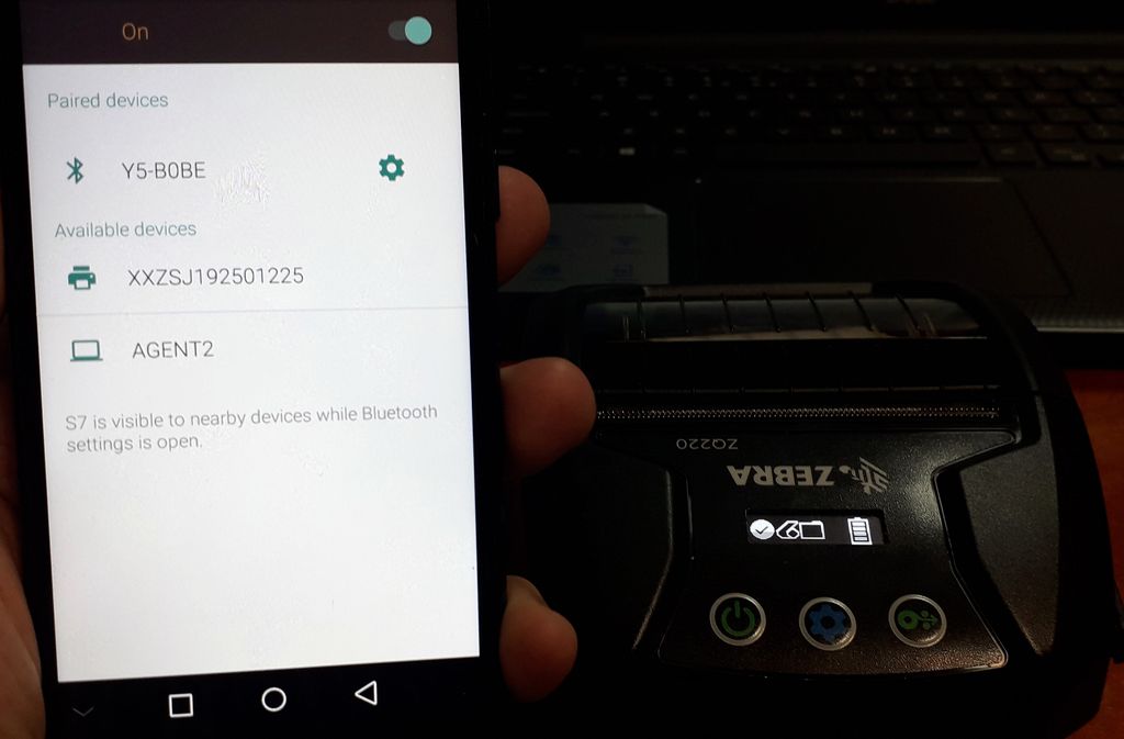 Pentru imperechere, se apasa pe terminal (telefon) PAIR si pe imprimanta butonul albastru din mijloc.