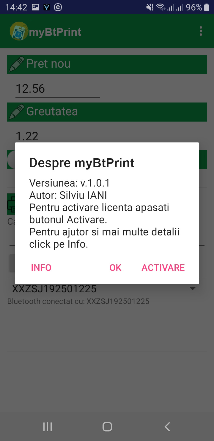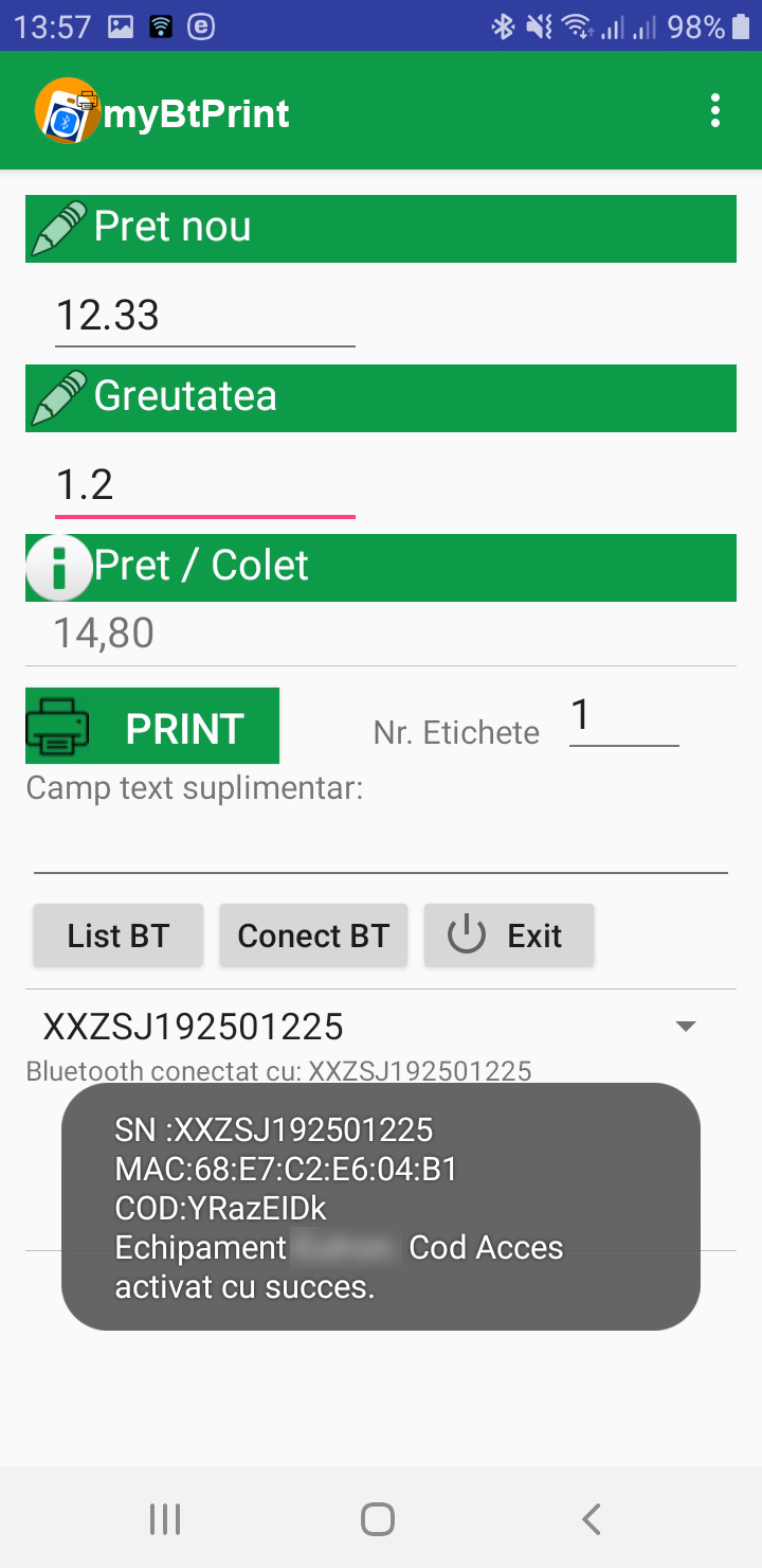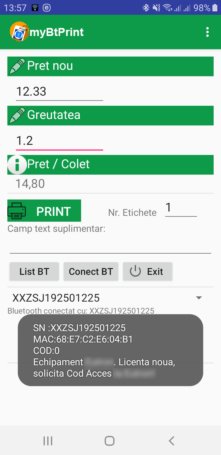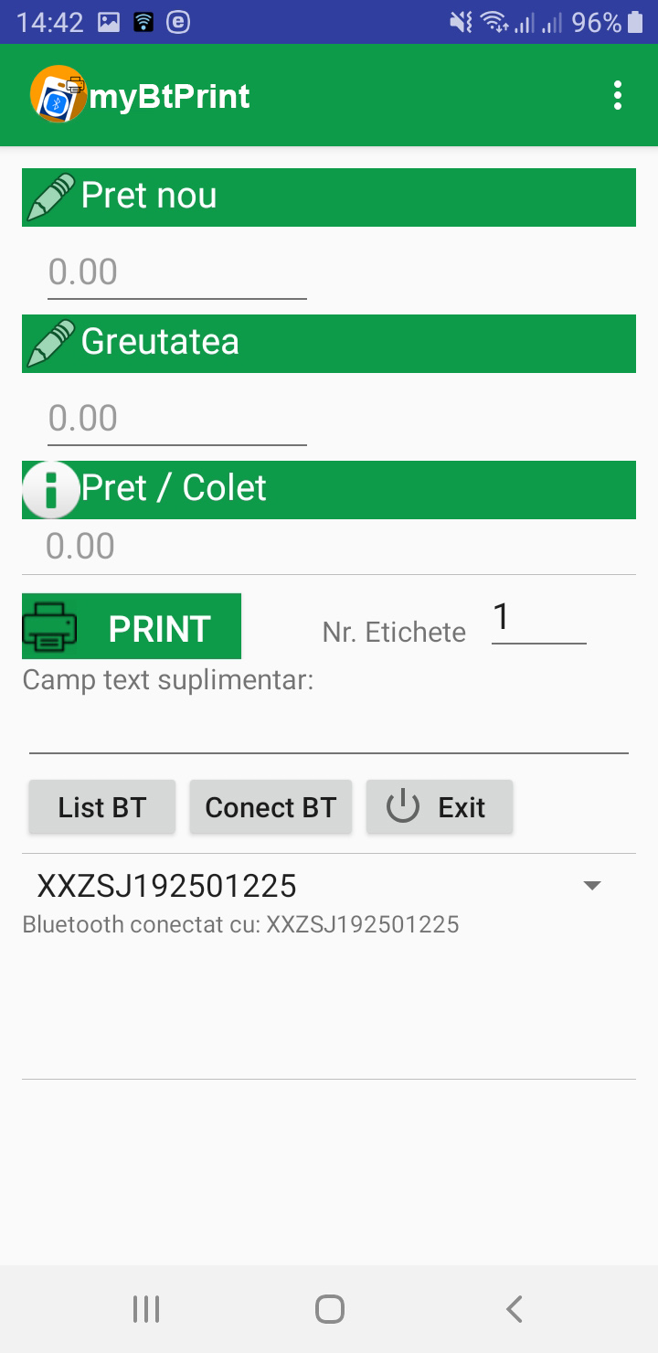 Atentie! La parasirea aplicatiei prin apasarea butonului EXIT va fi intrerupta automat conexiunea Bluetooth cu imprimanta. La urmatoarea utilizare a aplicatiei va trebui apasat mai intai butonul Conect BT, se asteapta mesajul de confirmare conectare (Bluetooth conectat cu: XXZS...), apoi se trece la utilizarea normala a aplicatiei, se completeaza campurile si se apasa butonul PRINT.