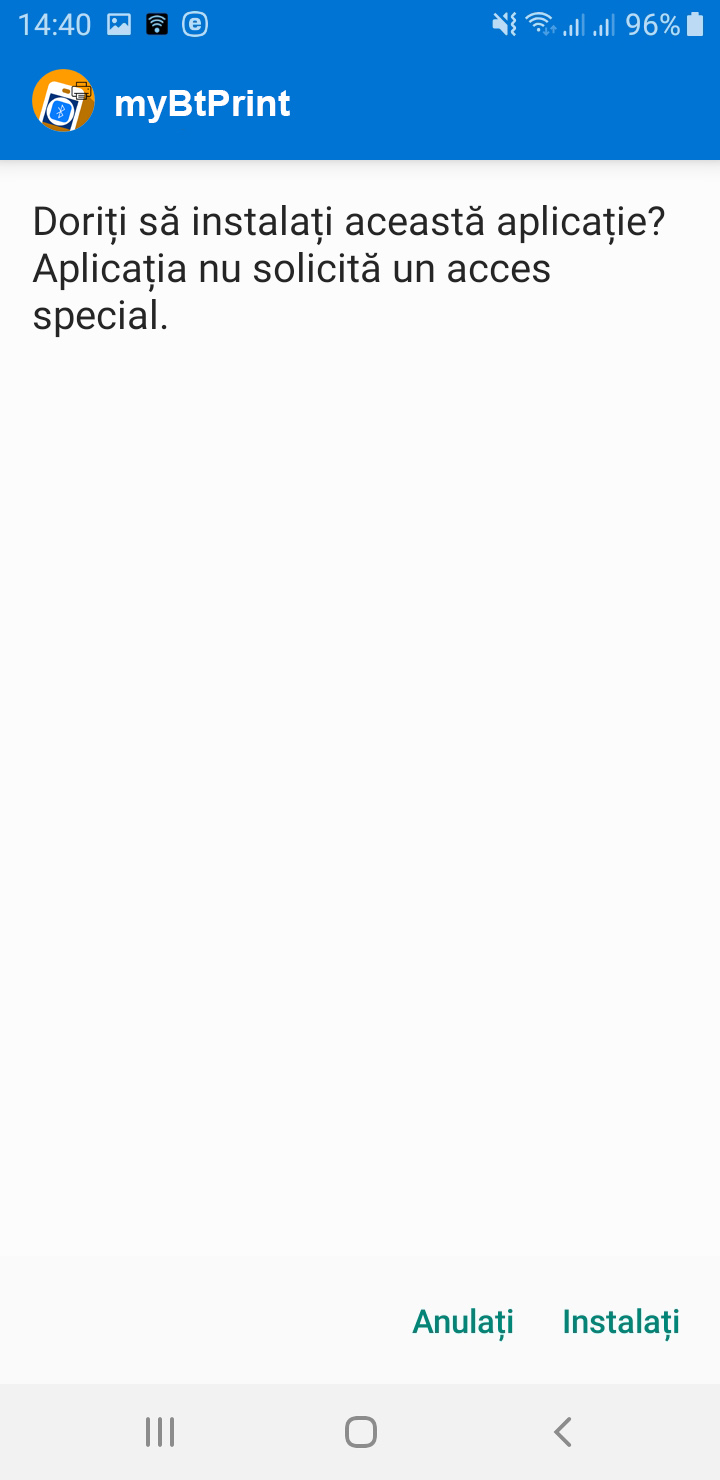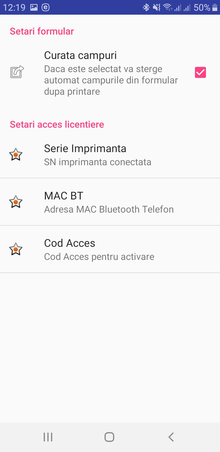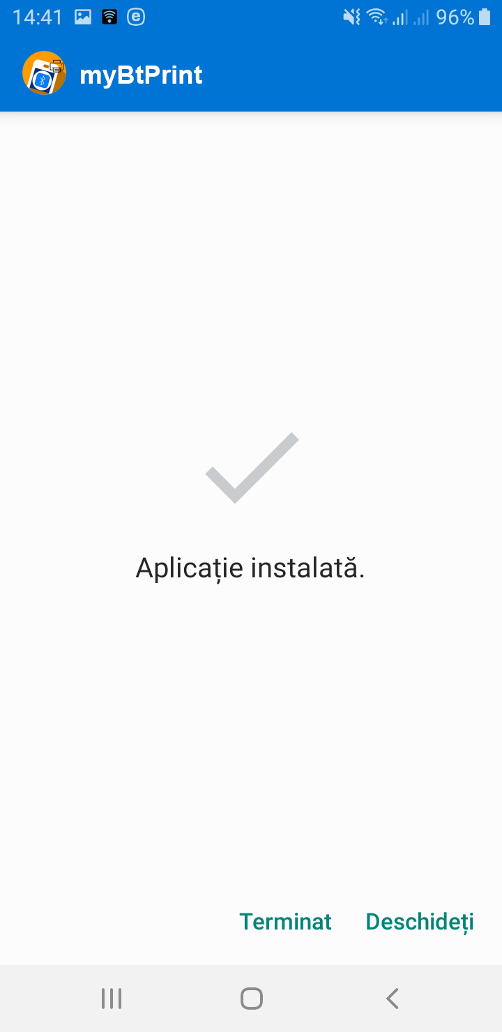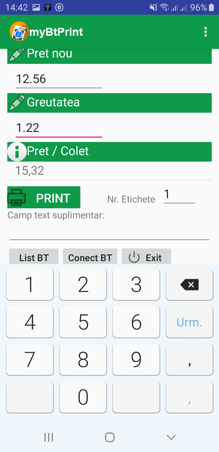 Atentie! La parasirea aplicatiei prin apasarea butonului EXIT va fi intrerupta automat conexiunea Bluetooth cu imprimanta. La urmatoarea utilizare a aplicatiei va trebui apasat mai intai butonul Conect BT, se asteapta mesajul de confirmare conectare (Bluetooth conectat cu: XXZS...), apoi se trece la utilizarea normala a aplicatiei, se completeaza campurile si se apasa butonul PRINT.